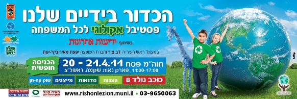 העיר ראשון לציון ממשיכה בעידוד המודעות לתחום איכות הסביבה, ומארחת, זו הפעם השלישית, את "פסטיבל הכדור בידיים שלנו". המדובר בפסטיבל אקולוגי ססגוני לכל המשפחה, שיתקיים במהלך חול המועד פסח, ב-20 וב-21 באפריל, בשעה 11 בבוקר עד 5 אחר הצהריים, בפארק נאות שקמה, בראשון לציון.הפסטיבל, ביוזמת ראש העירייה, דב צור, וחברת המועצה ומחזיקת תיק איכות הסביבה, יפעת מאירוביץ- יפת, יתמקד בנושא צרכנות נבונה והפרדת פסולת במקור. זאת, באמצעות סדנאות ליצירת מוצרים שימושיים מחומרים ממוחזרים בשימוש חוזר, מופעים ומיצגים והפעלות חווייתיות, אשר כולם באים להציג בפני המבקרים באופן מהנה את החשיבות שבהפרדת פסולת ובצרכנות נבונה. כל משתתף, גם המבוגרים, יוכלו לצאת מהפסטיבל עם יצירה שימושית מעשה ידיהם.