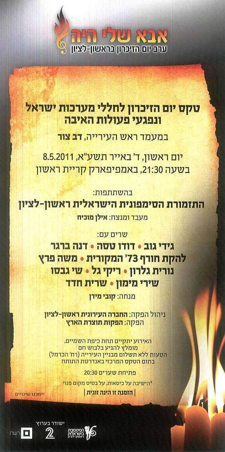 מופע ערב יום הזיכרון מאת:מיקי אלון ראש העירייה, דב צור: "ראשון לציון תתייחד גם השנה בערב יום הזיכרון עם זכרם של טובי בניה, החיילים ואנשי מערכות הביטחון שנפלו על הגנת הארץ והמולדת. יום הזיכרון עוטף, מחבק ומאחד את כולנו בתחושה אחת, תחושת הכאב, ההערכה וההוקרה, ההזדהות והגעגועים לבנינו ולבנותינו שנפלו במערכות ישראל. זהו רגע לאומי, של כולנו, כחברה הנשענת על חרבה, כחברה הממשיכה לשלוח את בניה ובנותיה לקרב למען ביטחונה וקיומה. אני מזמין כל אחת ואחד מכם להגיע לאמפי-פארק בערב יום הזיכרון ולקחת חלק באירוע המיוחד הזה". האמנים המשתתפים בערב: שרית חדד (כשהלב בוכה, אבא), גידי גוב (יורם, אין עוד יום), משה פרץ (שער הרחמים, שיר למעלות), שירי מימון (הרדופים, מקיץ אל חלום), נורית גלרון (ילדות נשכחת, השיר על הארץ – דואט עם דנה ברגר), ריקי גל (מקום לדאגה), דנה ברגר (ניגע אל החלום, השיר על הארץ – דואט עם נורית גלרון), דודו טסה (ערב מול גלעד), שי גבסו (מישהו גדול) וההרכב המקורי של "ילדי חורף 73". מנחה: קובי מידן. בין הסיפורים שיובאו בערב: מנכ"ל החברה העירונית המפיקה את האירוע, אלי פולק: "אני גאה על ההזדמנות אשר ניתנה לחברה העירונית על ידי ראש העירייה והנהלת העיר, להפיק ערב כה חשוב ובעל משמעות לחיבוק המשפחות השכולות "קבל עם ועדה", ובנוכחות עשרות אלפי תושבי העיר, אשר יכולים להתייחד עם זכר הנופלים באירוע מרגש בהשתתפות אמנים מן השורה הראשונה, יחד עם התזמורת הסימפונית ראשון לציון". המופע ישודר בערוץ 2 החל מהשעה 23:15.